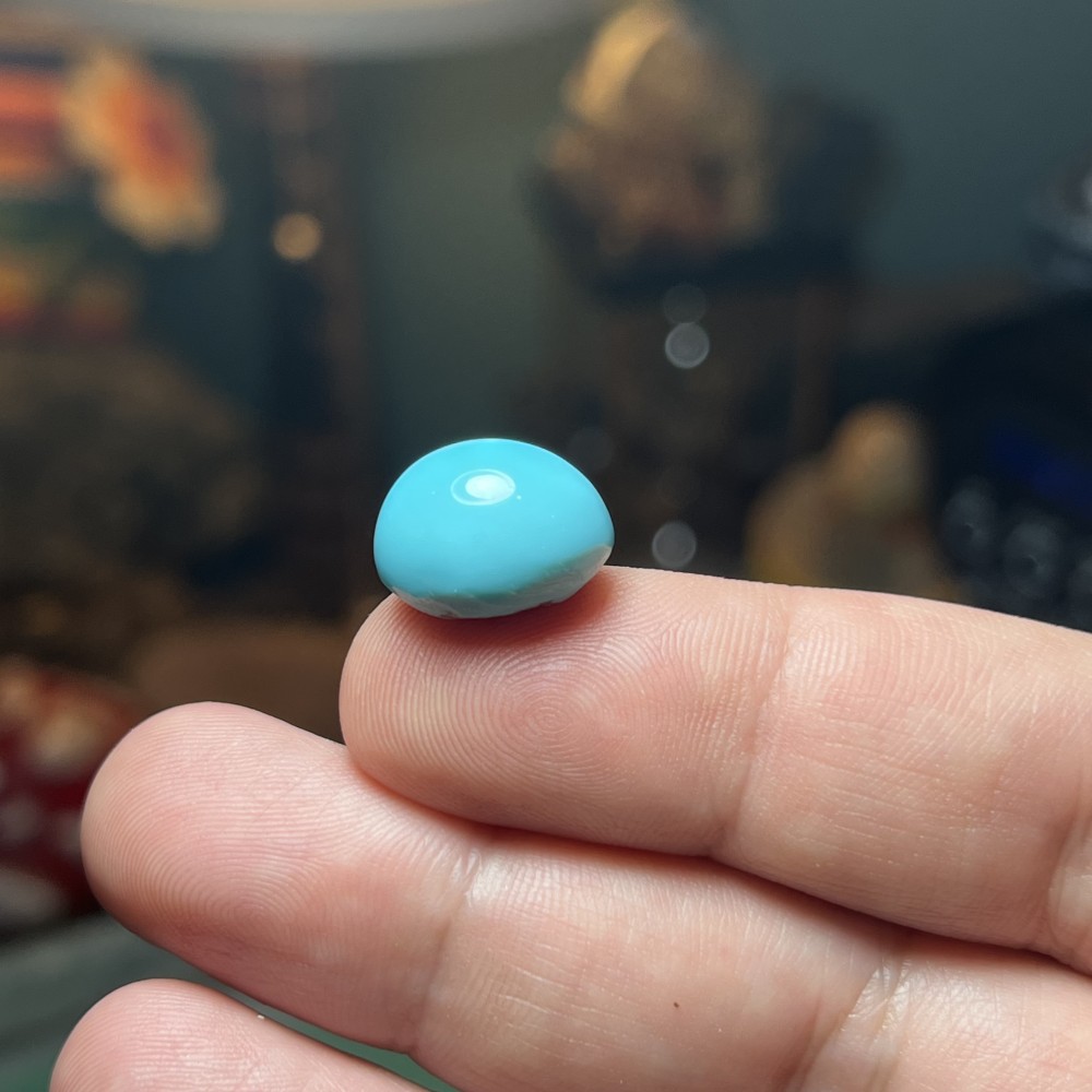 This particular stone has been stabilized to improve its hardness and preserve its color. The fact that its color has remained unchanged over the years suggests that the outer surfaces were effectively treated. However, whether the stabilization penetrated fully into the interior of the stone is unknown. In some cases, older turquoise has shown complete stabilization throughout, while in others, the treatment was only superficial—something that becomes evident only when the stone is cut.
