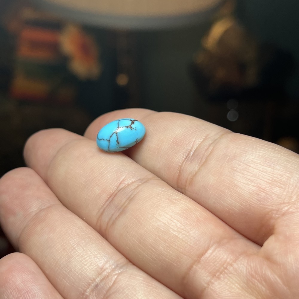 Aanvullende opmerking: Natuurlijke turkoois die niet volledig is gestabiliseerd, verandert na verloop van tijd op natuurlijke wijze van kleur. Dit is een normaal en verwacht proces. De steen kan worden beïnvloed door huidoliën, omgevingsvochtigheid en alledaagse chemicaliën zoals shampoo, parfum of schoonmaakmiddelen. Deze invloeden kunnen een verschuiving in de tint veroorzaken – vaak richting een groenachtige kleur – vooral op plekken met veel blootstelling. Dit gedrag maakt deel uit van het organische karakter van de steen en wordt door veel verzamelaars gewaardeerd vanwege zijn veranderende schoonheid.